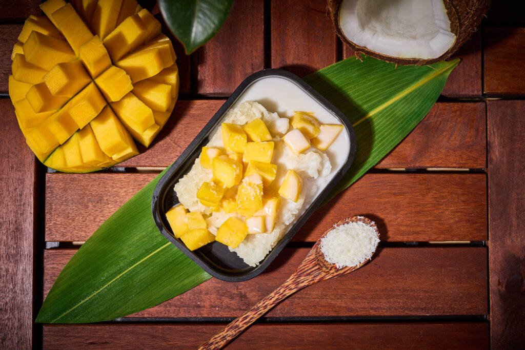 Riz gluant fondant, nappé de lait de coco onctueux et accompagné de mangue fraîche et juteuse. Un mélange doux, crémeux et fruité pour finir en beauté 😋